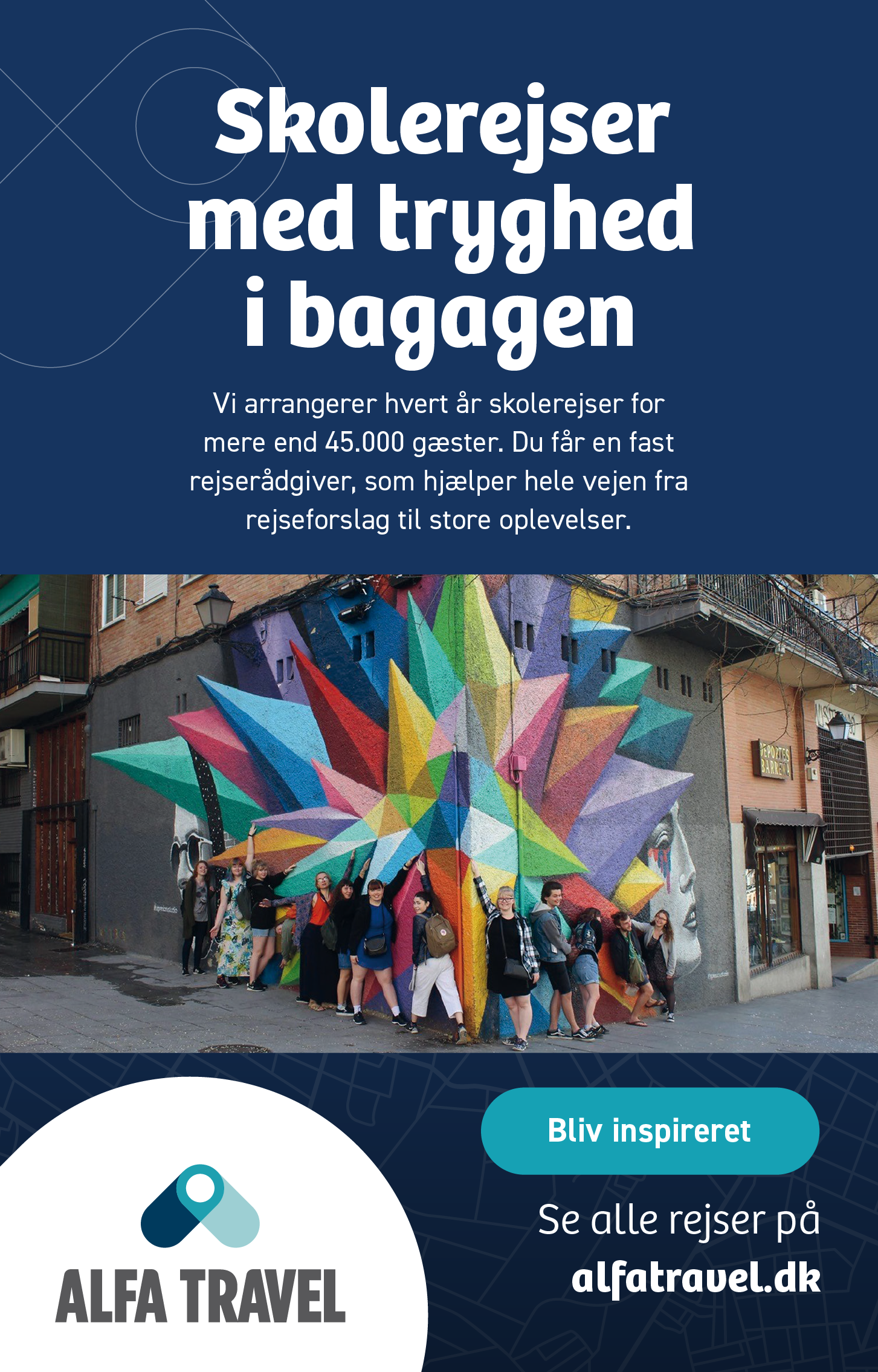 Hos os får du en fast kontaktperson men lang erfaring. Din rejserådgiver følger dig gennem hele planlægningen og undervejs på rejsen. Det er vores mål, at din planlægning skal være så gnidningsfri som mulig, så skolerejsen ikke giver dig alt for meget sved på panden. Det er vores motto, at “vi står for det”. Det betyder, at vi tager ansvaret på os, – både i grundig planlægning men også hvis det uventede skulle ske. Søg inspiration til jeres næste rejse på vores hjemmeside: https://url41.mailanyone.net/scanner?m=1vgINw-000000007yw-3opO&d=4%7Cmail%2F90%2F1768464000%2F1vgINw-000000007yw-3opO%7Cin41i%7C57e1b682%7C25250767%7C14105258%7C6968A034DFE2691E992BE545FF0CC394&o=a.wwrlftwakd.leva&s=gi2AgC7RLX1zdEhesK_iUCcKgKM.