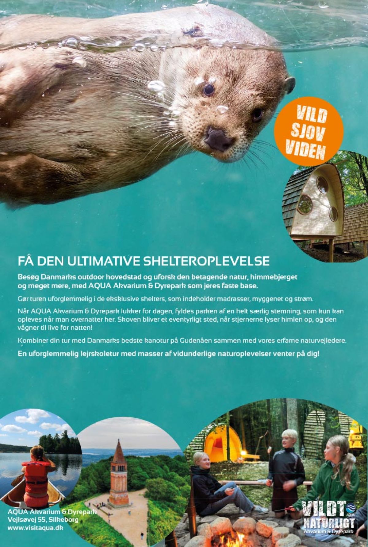 AQUA Akvarium & Dyrepark i Silkeborg er et stort, familievenligt oplevelsescenter om den danske natur. Vi er Nordeuropas eneste ferskvandsakvarium og det eneste sted, du kan komme tørskoet til søens bund. Vi kan dog ikke garantere, at du kommer tørskoet fra “Vandets Kraft”!