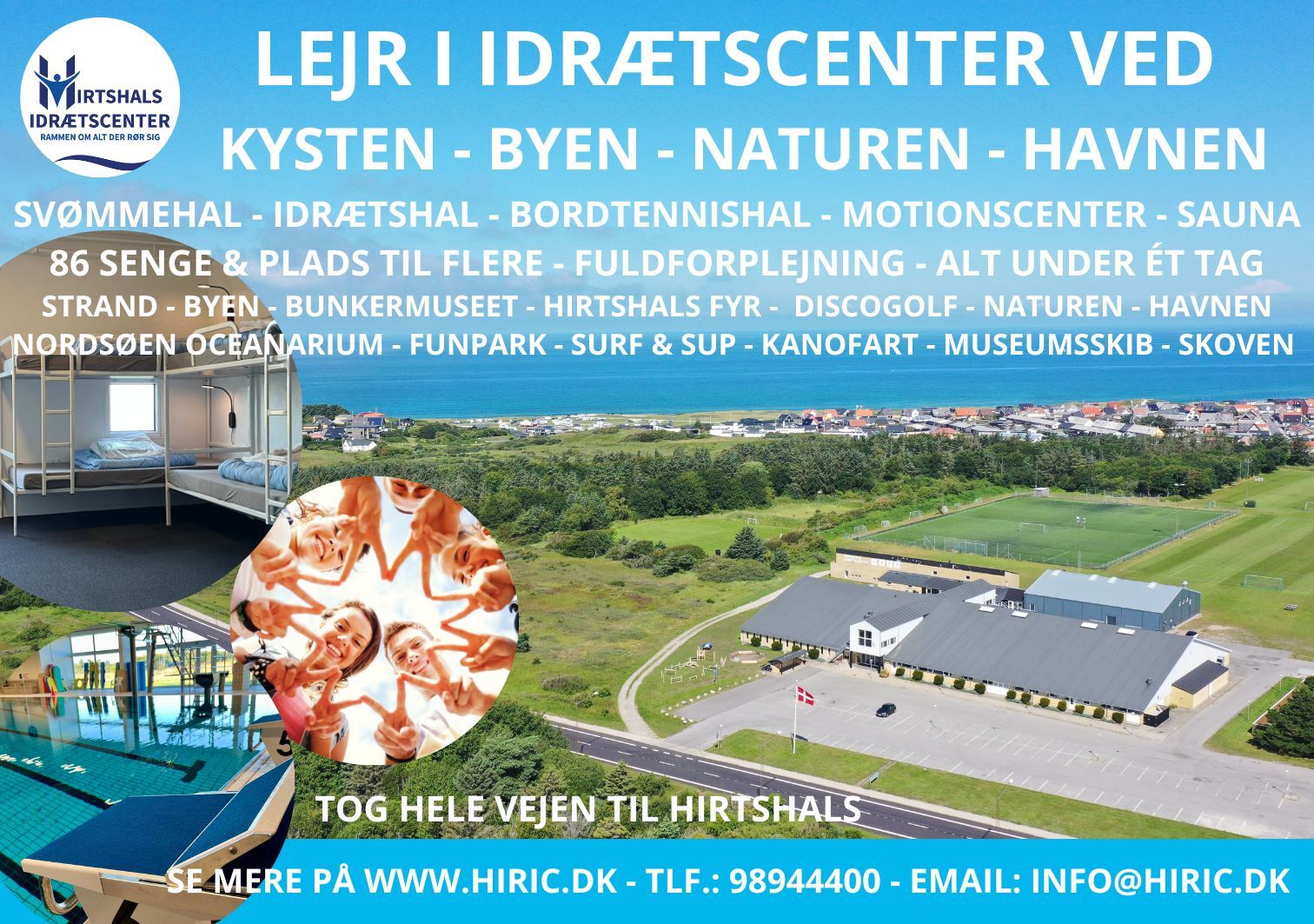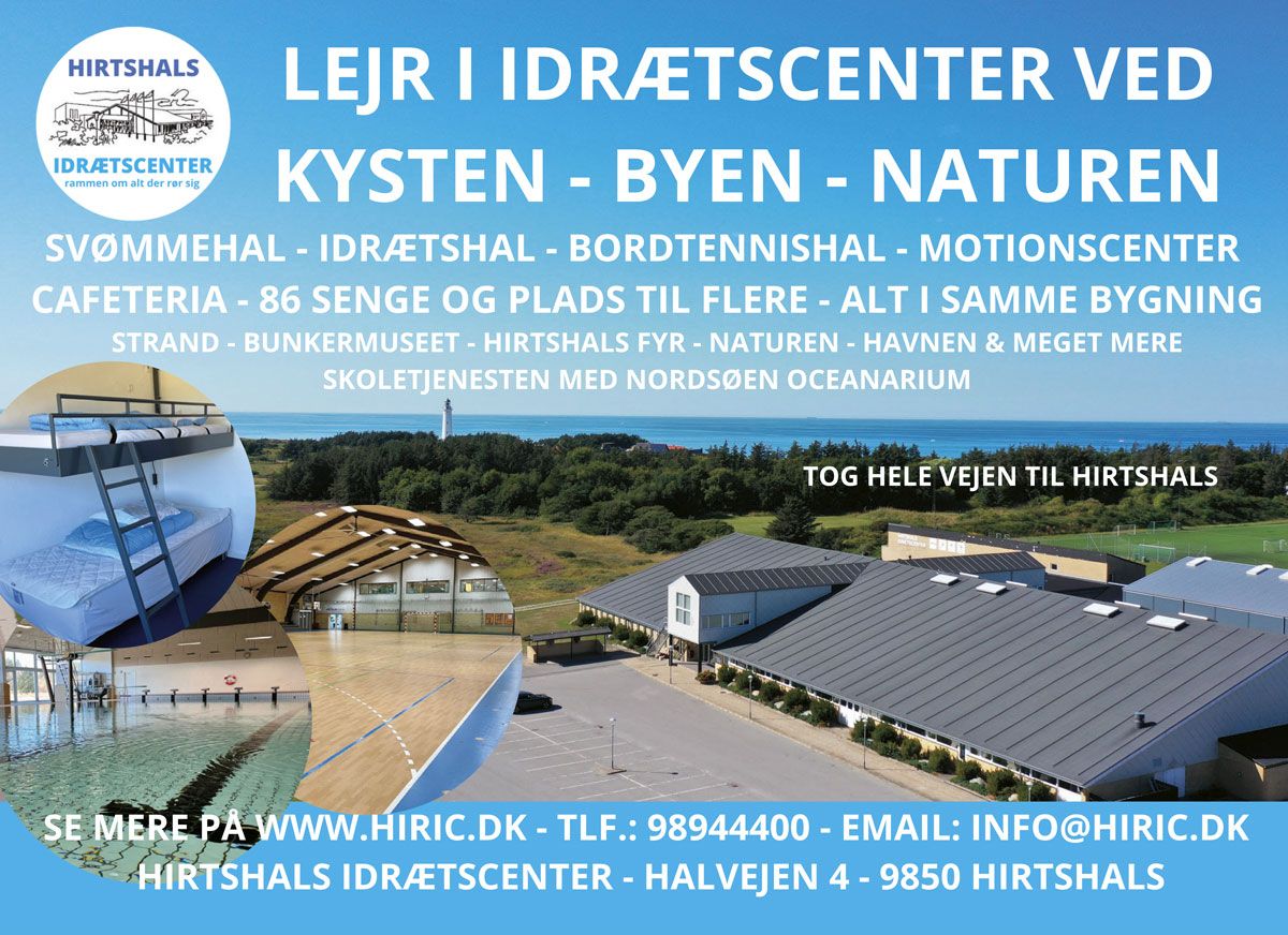 Hirtshals Idrætscenter arrangerer, med stor succes, lejrskole og træningsophold for alle typer af grupper. Vi har haft alt fra almindelige skoleklasser og sportsgrupper til symfoniorkester på besøg, så intet er umuligt. Vi er meget fleksible og går meget op i at gæsterne får en skønt ophold hos os med smil og gode oplevelser. Vores center har nogle gode rammer som vi får meget ros for og så har vi en fantastisk natur omkring os der er rig på oplevelser for alle.