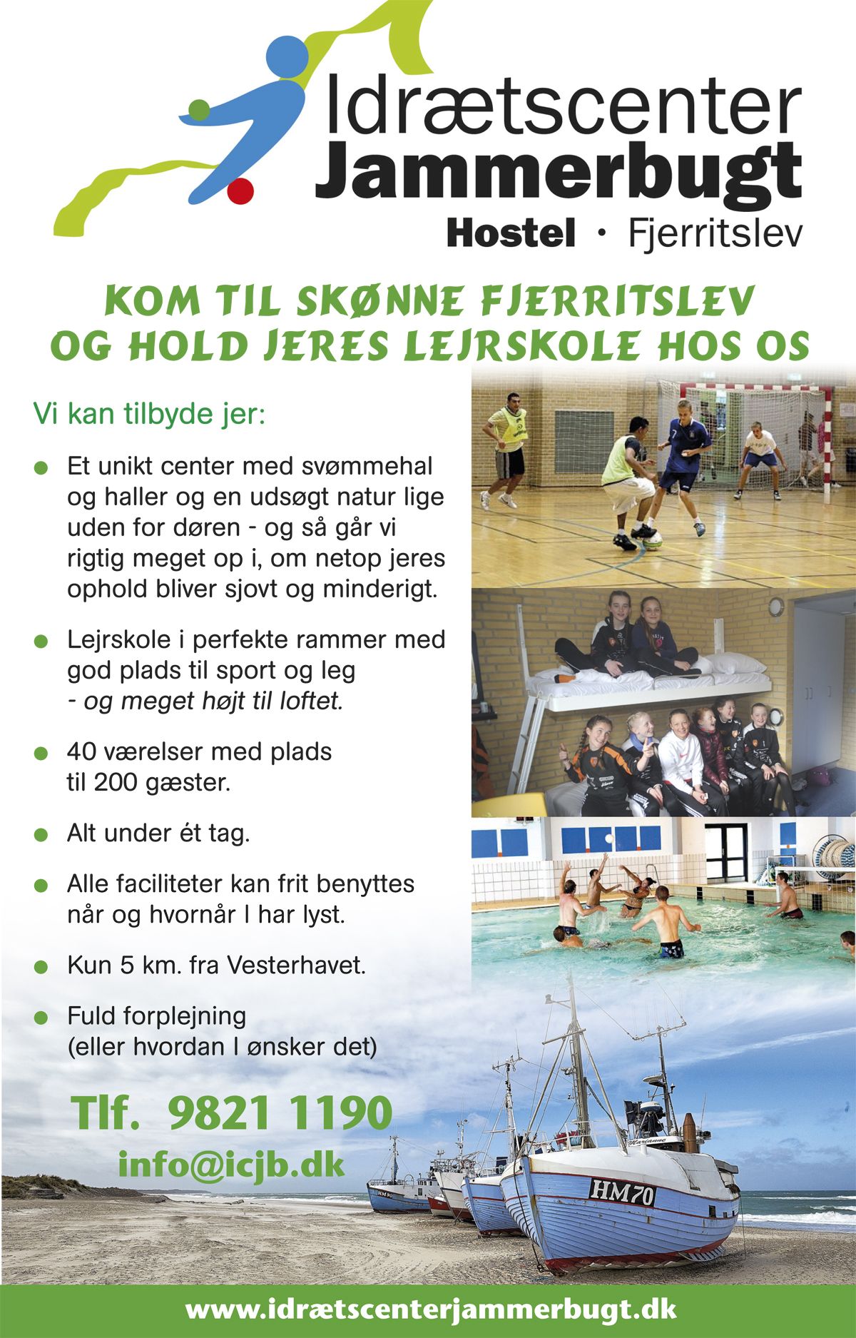 Midt i hjertet af Fjerritslev, Nordjylland – omgivet af både skov og strand – finder I Idrætscenter Jammerbugt, hvor vi dyrker begrebet “aktiv afslapning”. Her får I de ideelle rammer til en lejrskole med en kombination af bevægelse, samvær og komfort.