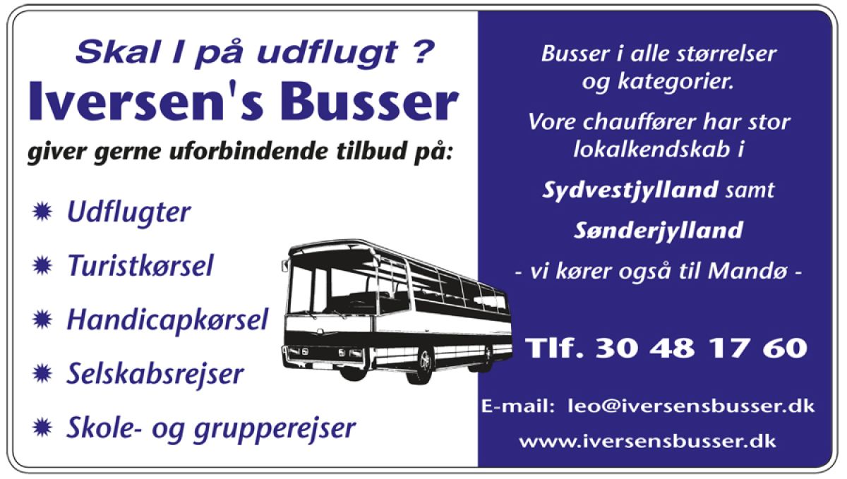 Iversens busser betjener en bred kundekreds med forskellige behov. Vi har 3 luksus turistbusser med tv, toilet, køkken, dvd og vippestole. Vi kan bygge borde i disse køretøjer efter behov. Der er god benplads. Vi har også 3 handicapbusser alle med lift 1 stor liftbus til 20 personer samt 3 landevejsbusser med sikkerhedseler.