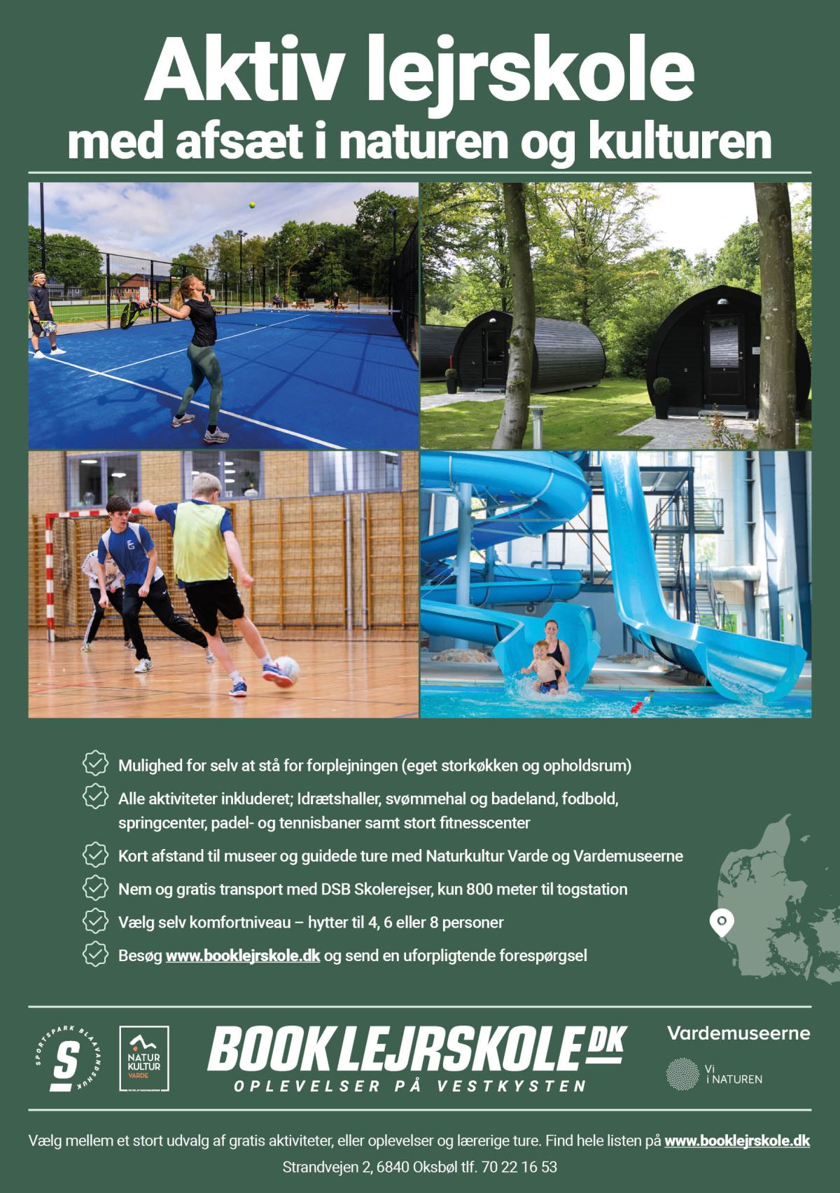 I Oksbøl i Vestjylland finder I jeres næste lejrskole destination. Hos Sportspark Blaavandshuk tilbydes overnatning i lækre nye hytter midt i naturen og tæt på centrets mange gratis faciliteter. Få et ophold med alt inkluderet, alle faciliteter og stort køkken til egen madlavning. Skab indhold med ture og oplevelser ud i naturen og hos de mange lokale museer, Tirpitz, FLUGT, Artillerimuseum, eller oplev den storslåede natur i klitplantagerne, Vesterhavet eller med en tur til Vadehavet. Vi arbejder tæt sammen med både Varde Museerne og Naturkultur Varde.